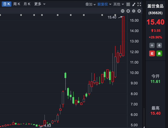 个股掀涨停潮,盖世食品(15.400, 3.55, 29.96%)30%涨停,创历史新高(复权,下同)。
