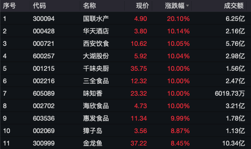 国联水产(4.900, 0.82, 20.10%)20%涨停,创11个月来新高;西安饮食(10.620, 0.97, 10.05%)、味知香(23.320, 2.12, 10.00%)、海欣食品(4.730, 0.43, 10.00%)、三全食品(12.320, 1.12, 10.00%)等多股涨停或涨超10%。
